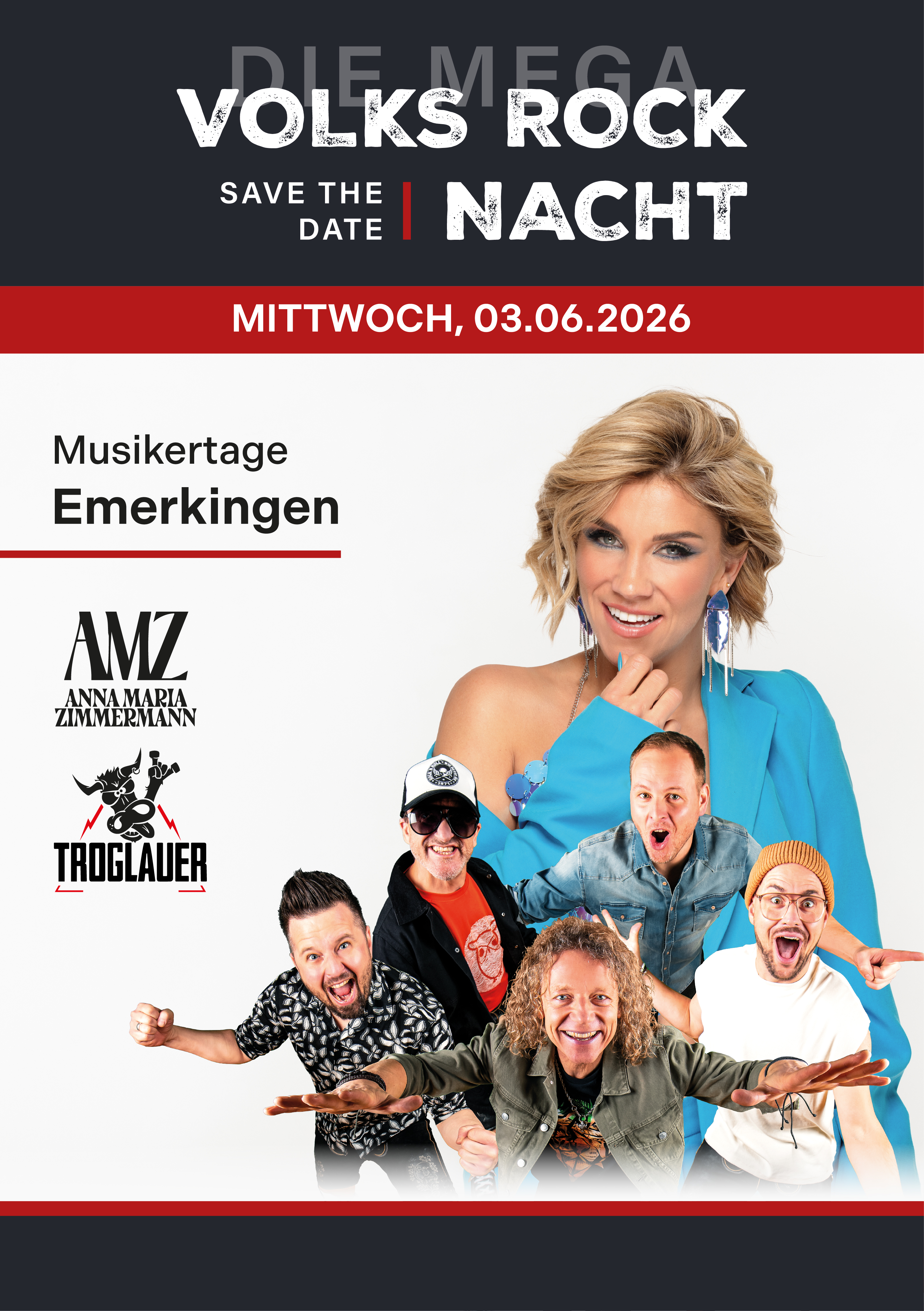- Nach ihrem gefeierten Auftritt bei der ersten MEGA VOLKSROCKNACHT 2023 kehrt sie zurück nach Emerkingen! Mit bekannten Hits wie „Himmelblaue Augen“ und „100 Träume weit“ sowie ihrer energiegeladenen Bühnenpräsenz sorgt sie erneut für beste Laune und pure Partystimmung.